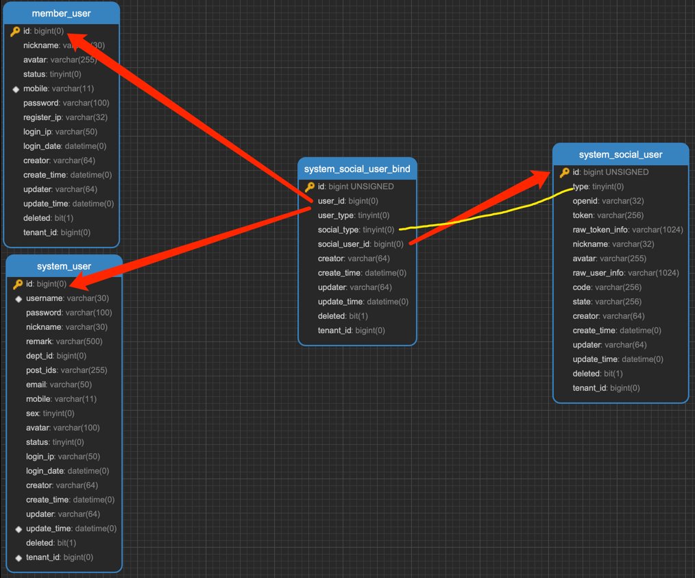 ① 三方登录完成时,系统会将三方用户存储到 system_social_user (opens new window) 表中,通过 type (opens new window) 标记对应的第三方平台。